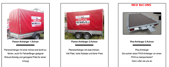 Wir stehen Ihnen mit Rat und Tat zur Seite, wenn Sie Schwierigkeiten bei der Auswahl des richtigen Anhängers oder der Anbringung haben. Lassen Sie sich von unserem qualifizierten Team beraten, welcher Anhänger für Ihre Zwecke der Richtige ist. Zusätzlich bieten wir Ihnen umfangreiches Zubehör zum Transport Ihrer Gegenstände an, das Sie mieten und kaufen können. Mieten Sie rechtzeitig einen Transporter, Anhänger in dem Sie die Reservierung telefonisch vornehmen